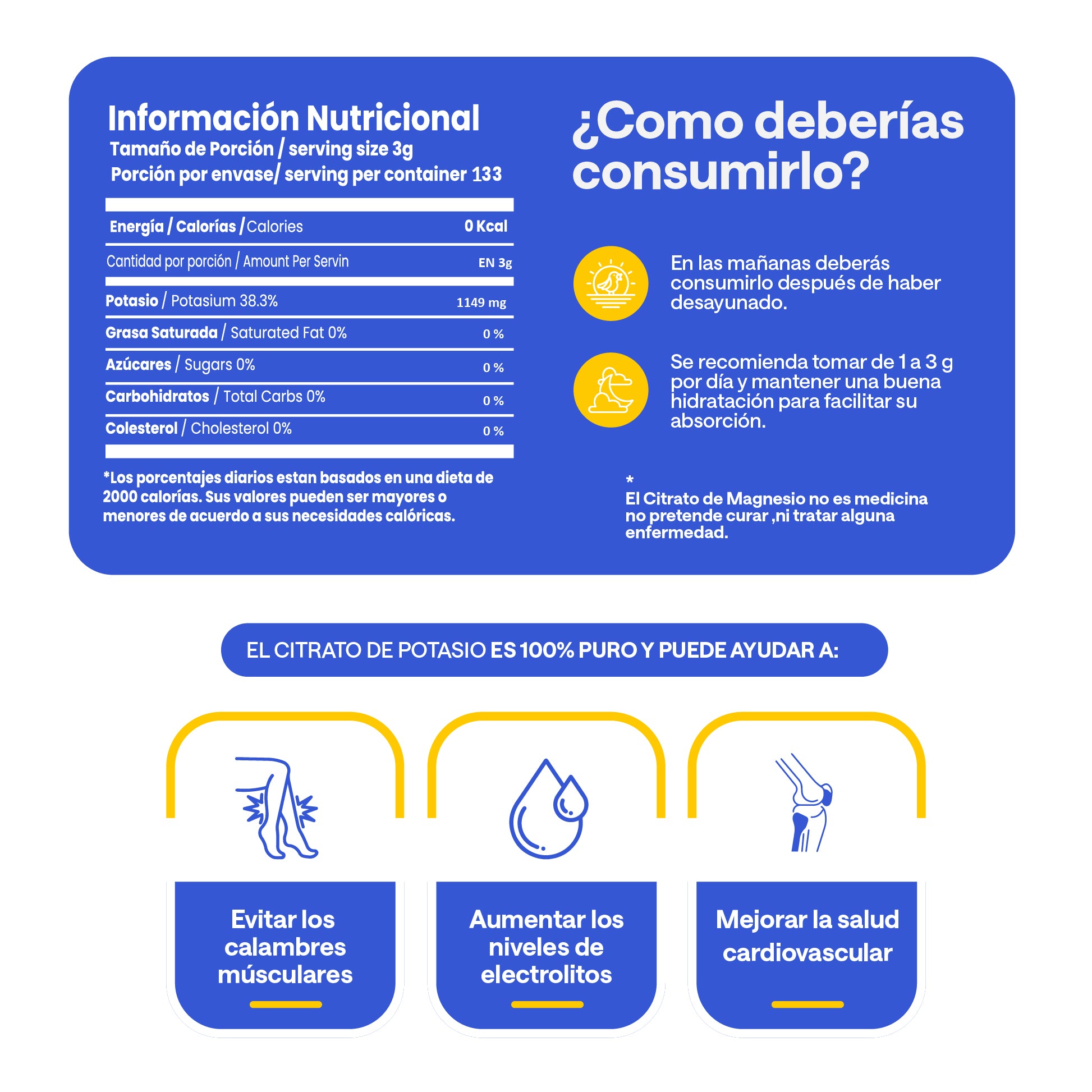 Este mineral de potasio es ideal para quienes buscan integrar este importante mineral en su día a día. Con un diseño conveniente para acompañar una dieta equilibrada, esta fórmula de alta calidad facilita el consumo de potasio de manera práctica.